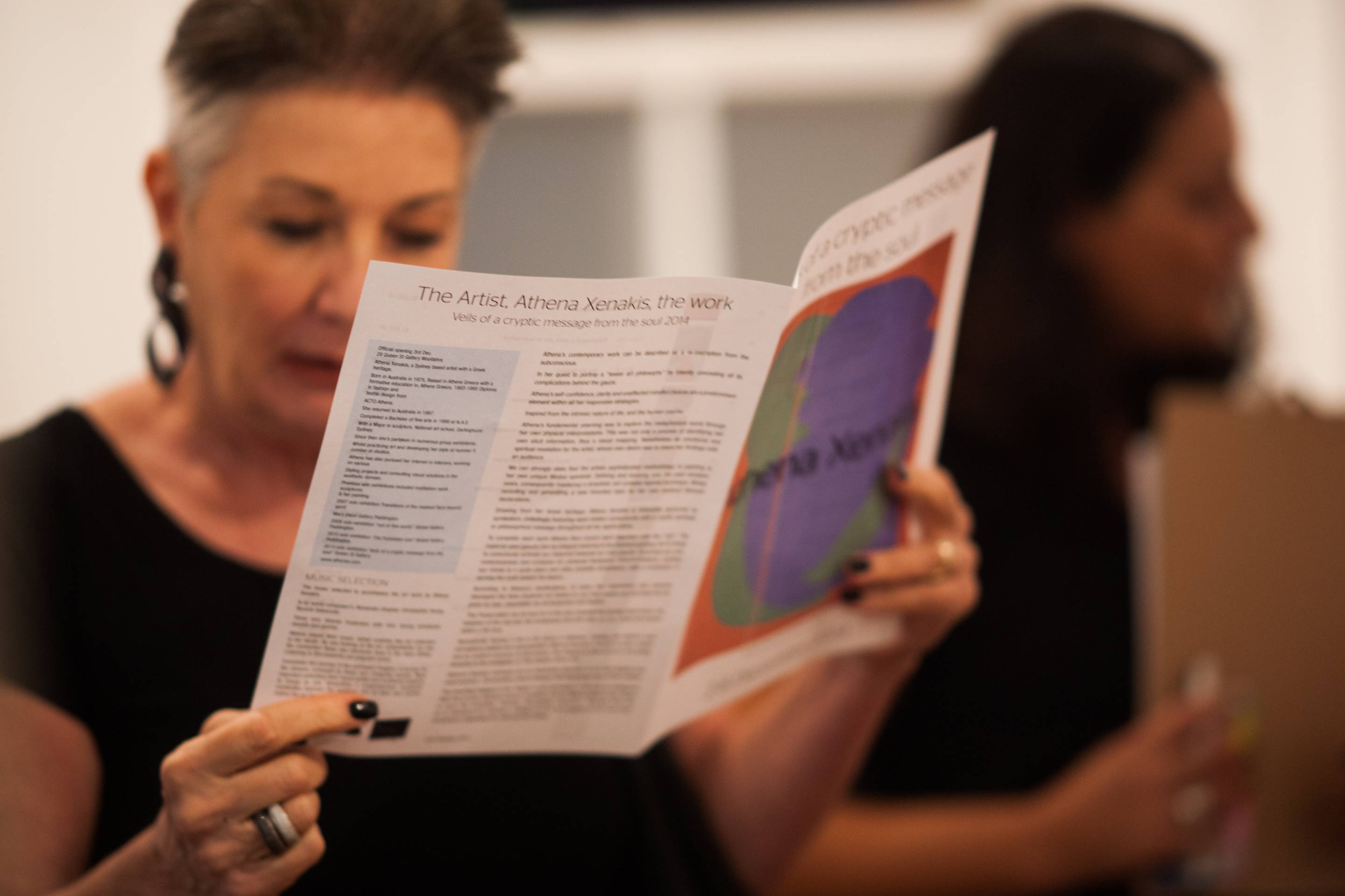 The honourable Greek Ambassador Mr Haris Dafaranos who kindly travelled from the capital Canberra, was amongst the guests, accompanying his wife Ms Eyvah T.Dafaranos who opened the show with her captivating poem 28 artistic veils of a cryptic message from the soul , personally created to accompany Athena’s , 28 paintings. The art work hung on the walls of the gallery with a minimalist calming effect, transmitting a sense of freshness to the whole ambience of the gallery whilst transcending the viewers to other dimensions of their own interpretations.